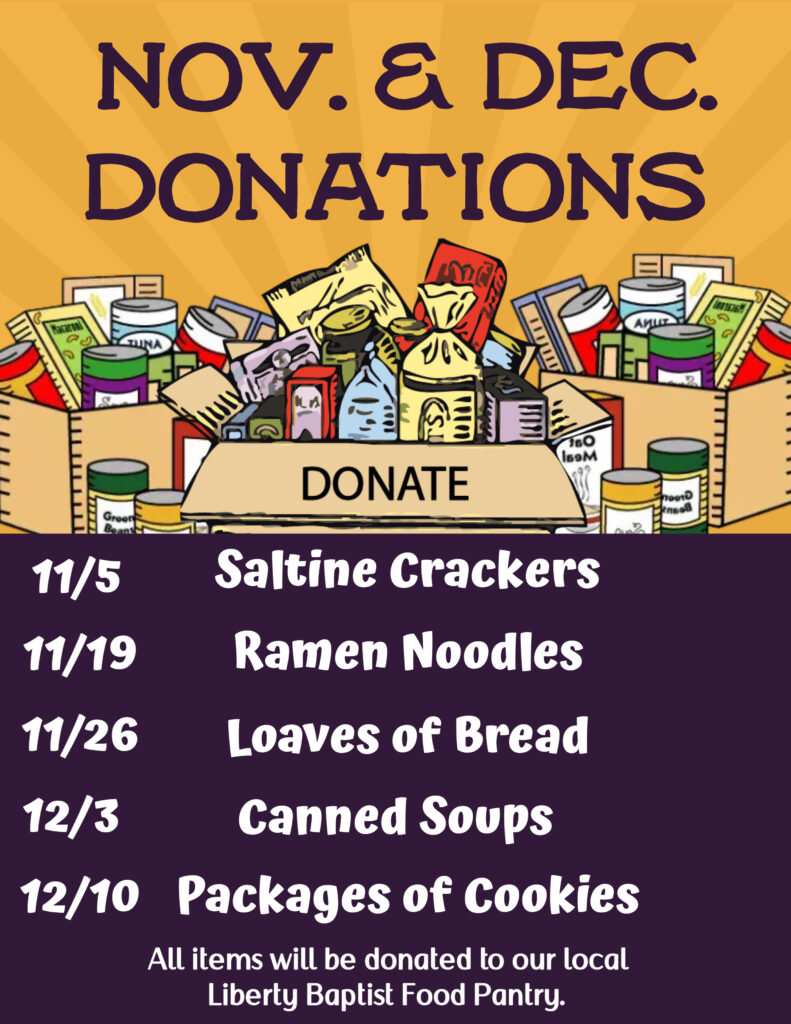 Each month we collect items for different ministries in our community. During the months of November and December, we are collecting items for our local Food Pantry. Please see the monthly flyer below. We greatly appreciate the donations we receive each week. It is a blessing to be able to serve others. We are looking forward to seeing you on Wednesday! You don’t want to miss out!