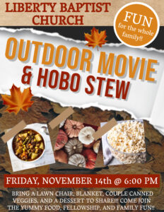 Come join us for our annual Hobo Stew and Family Movie Night on Friday, November 14th.